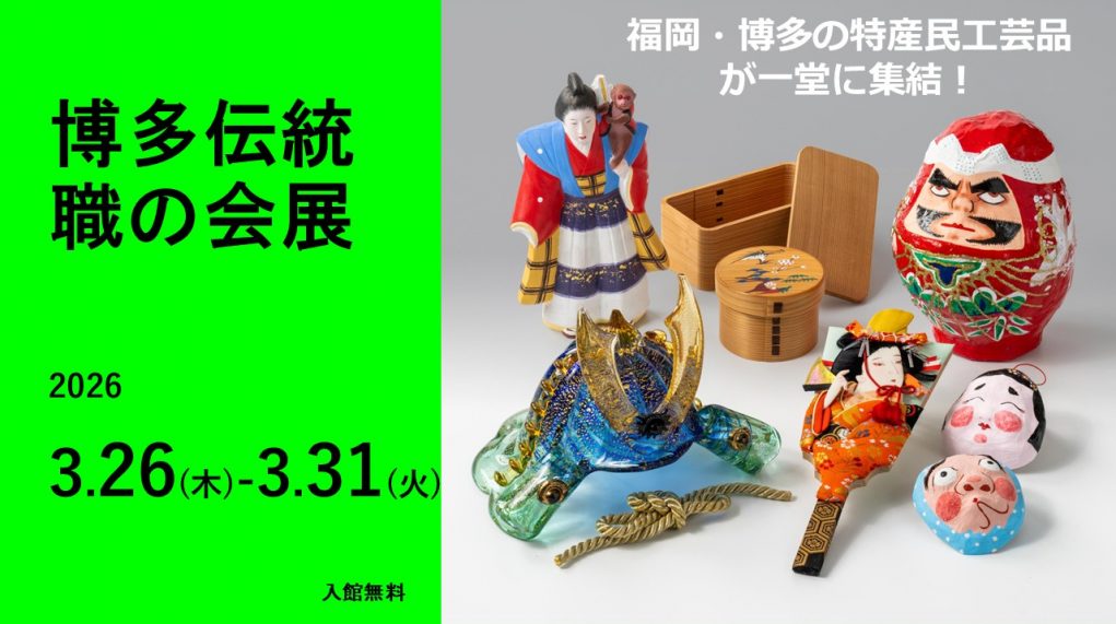 最新情報 一覧を見る 2026.03.16お知らせ 【イベント】3.26-3.31「博多伝統職の会展」開催のお知らせ 2026.03.05お知らせ 【イベント】3.19-3.24「令和7年度博多人形師育成塾作品発表会」開催のお知らせ 2026.02.18お知らせ 【イベント】3.5-3.10「木村博多織手織り専門工房作品展」開催のお知らせ 一覧を見る 体験教室 一覧を見る 2026.03.15お知らせ 4月19日(日)博多織の体験教室は 「手織りの博多織でつくる小さながま口」もしくは「手織りの博多織でつくるがま口の印鑑ケース」を開催します。 2026.03.01お知らせ 4月5日(日)体験教室は博多人形「干支」絵付け体験を開催します! 2026.02.19お知らせ 3月15日(日)博多織の体験教室は 「手織りの博多織でつくる小さながま口」もしくは「手織りの博多織でつくるがま口の印鑑ケース」を開催します。 一覧を見る 作家・他施設情報 一覧を見る 2026.02.04お知らせ 【お知らせ】2.11-2.22 くまもと工芸会館との交流事業「筑前博多の伝統工芸品展」開催のお知らせ 2026.01.08お知らせ 1月9日(金)~12日(月・祝)博多駅構内マイング広場で福岡・博多の伝統工芸品の 販売会を開催します! 2025.12.22お知らせ 【お知らせ】今年も博多阪急「福の縁起物市」に出展します! 一覧を見る 知る はかたの伝統工芸とは 知る はかたの伝統工芸とは 博多織 博多人形 博多曲物 博多独楽 博多鋏 博多張子 博多おきあげ マルティグラス 今宿人形 深める 工芸の歴史と未来 職人と技 作家紹介 施設案内 はかた伝統工芸館について はかた伝統工芸館利用案内 買う 博多織/博多人形販売店舗一覧