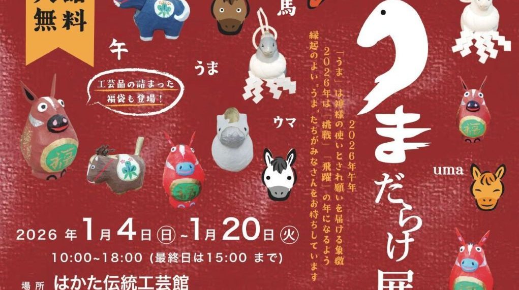 最新情報 一覧を見る 2026.01.06お知らせ 【イベント】1.22-2.3「かわいいパンダ展」開催のお知らせ 2025.12.11お知らせ 【イベント】2026.1.4-1.20「うまだらけ展」開催のお知らせ 2025.11.26お知らせ 【イベント】12.4-12.9「第7回 西山陽一個展『Greatest Fruits(最高の果実)』」 一覧を見る 体験教室 一覧を見る 2025.12.21お知らせ 1月18日は博多織の生地を使った「帯地キーホルダー作り」を開催します。 2025.12.21お知らせ 新年最初の3連休、1月11(日)は博多張子「だるまの絵付け体験」をします。 2025.12.14お知らせ 【受付終了】1月4日(日)新年一発目は博多人形「干支・午」の絵付け体験を開催します。 一覧を見る 作家・他施設情報 一覧を見る 2025.12.22お知らせ 【お知らせ】今年も博多阪急「福の縁起物市」に出展します! 2025.02.17お知らせ 【イベント】2.19-3.2 くまもと工芸会館にて「筑前博多の伝統工芸品展」開催! 2024.12.25お知らせ 博多織ており作家展 手から手へ 2月26日(水)~3月3日(月)アクロス福岡1階 匠ギャラリー ギャラリー1で開催! 一覧を見る 知る はかたの伝統工芸とは 知る はかたの伝統工芸とは 博多織 博多人形 博多曲物 博多独楽 博多鋏 博多張子 博多おきあげ マルティグラス 今宿人形 深める 工芸の歴史と未来 職人と技 作家紹介 施設案内 はかた伝統工芸館について はかた伝統工芸館利用案内 買う 博多織/博多人形販売店舗一覧