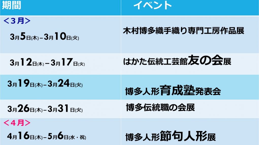 最新情報 一覧を見る 2026.03.05お知らせ 【イベント】3.19-3.24「令和7年度博多人形師育成塾作品発表会」開催のお知らせ 2026.02.18お知らせ 【イベント】3.5-3.10「木村博多織手織り専門工房作品展」開催のお知らせ 2026.01.26お知らせ 【イベント】2.5-2.17「博多人形雛人形展」開催のお知らせ 一覧を見る 体験教室 一覧を見る 2026.03.01お知らせ 4月5日(日)体験教室は博多人形「干支」絵付け体験を開催します! 2026.02.19お知らせ 3月15日(日)博多織の体験教室は 「手織りの博多織でつくる小さながま口」もしくは「手織りの博多織でつくるがま口の印鑑ケース」を開催します。 2026.02.19お知らせ 3月8日(日)博多張子「だるまの絵付け体験」をします。 一覧を見る 作家・他施設情報 一覧を見る 2026.02.04お知らせ 【お知らせ】2.11-2.22 くまもと工芸会館との交流事業「筑前博多の伝統工芸品展」開催のお知らせ 2026.01.08お知らせ 1月9日(金)~12日(月・祝)博多駅構内マイング広場で福岡・博多の伝統工芸品の 販売会を開催します! 2025.12.22お知らせ 【お知らせ】今年も博多阪急「福の縁起物市」に出展します! 一覧を見る 知る はかたの伝統工芸とは 知る はかたの伝統工芸とは 博多織 博多人形 博多曲物 博多独楽 博多鋏 博多張子 博多おきあげ マルティグラス 今宿人形 深める 工芸の歴史と未来 職人と技 作家紹介 施設案内 はかた伝統工芸館について はかた伝統工芸館利用案内 買う 博多織/博多人形販売店舗一覧