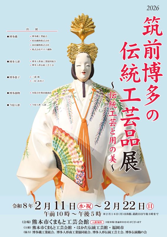 作家・他施設情報 2026.02.04 【お知らせ】2.11-2.22 くまもと工芸会館との交流事業「筑前博多の伝統工芸品展」開催のお知らせ 2026.01.08 1月9日(金)~12日(月・祝)博多駅構内マイング広場で福岡・博多の伝統工芸品の 販売会を開催します! 2025.12.22 【お知らせ】今年も博多阪急「福の縁起物市」に出展します! 2025.02.17 【イベント】2.19-3.2 くまもと工芸会館にて「筑前博多の伝統工芸品展」開催! 2024.12.25 博多織ており作家展 手から手へ 2月26日(水)~3月3日(月)アクロス福岡1階 匠ギャラリー ギャラリー1で開催! 2024.12.21 【イベント】12.26-2025.1.7まで「博多阪急 福の縁起物市」に出展します! 2024.11.23 12月4日~12月16日まで「超コウゲイ展」が、アクロスにある匠ギャラリーで開催されます。 2024.09.28 【お知らせ】10.5-10.6「青年会議所第73回全国大会福岡大会」に「はかた伝統工芸館」出張します! 2024.09.10 【お知らせ】「福岡博多伝統工芸品まつり」開催のお知らせ 123