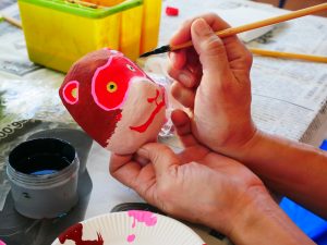 博多張子のミニお面(サルまたはおたふく)の絵付けが体験できます。