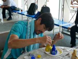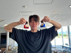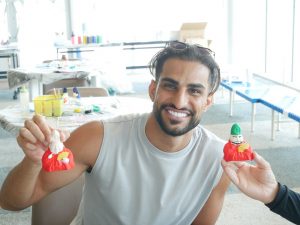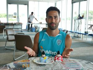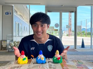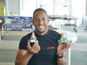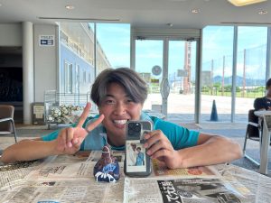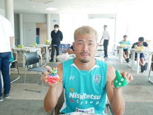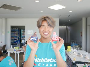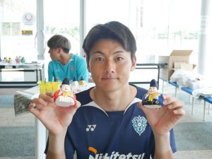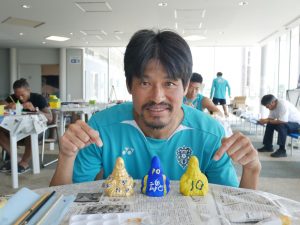 そして、見本に忠実に長時間かけて制作していたキム ムンヒョン選手。まずは、見本の福の神さまを丁寧に仕上げ、2作品目は、博多人形師・田中勇気さんが作った「福の神アビスパバージョン」をお手本に、見事な“アビスパ福の神”を仕上げました!お見事!