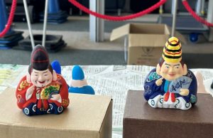 今回の企画展のために選手有志たちが絵付けした「福の神」の作品を展示します。